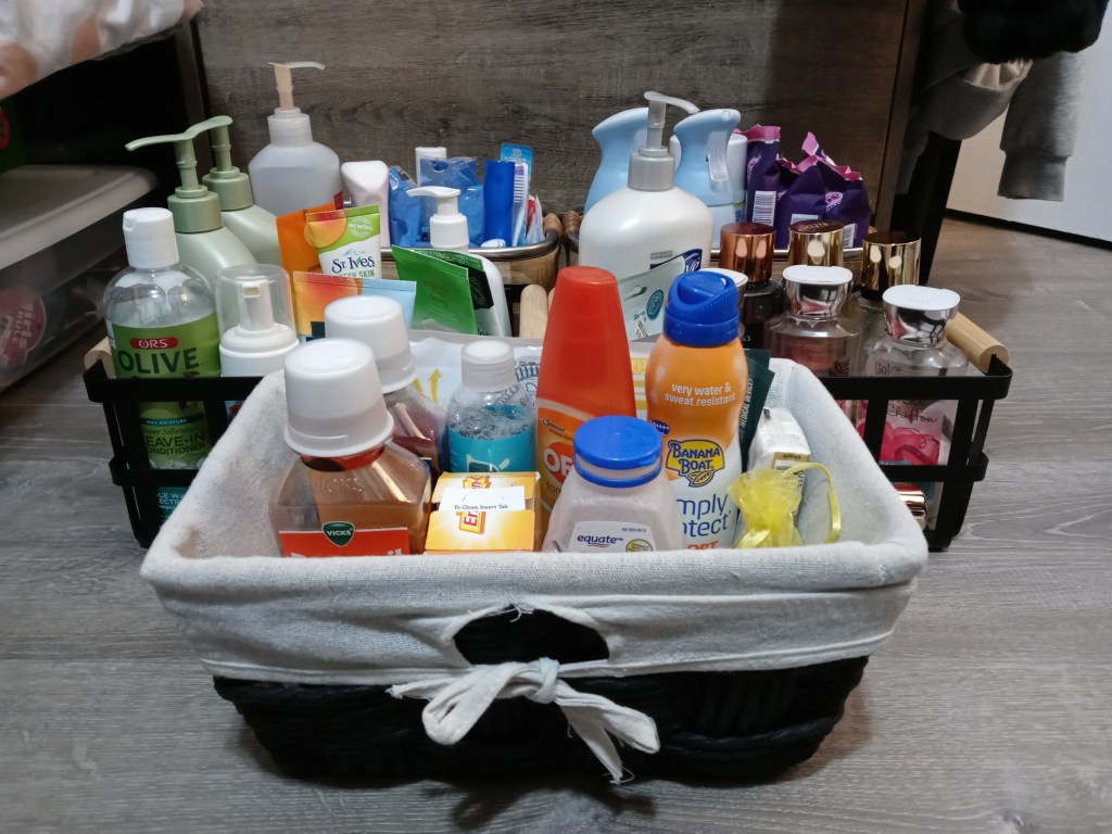 Now that you have cleared everything out, hopefully gotten rid of some things, and sorted everything it’s time to put away what is left. I do not suggest trying to mix & match different items into your bins. Instead, put like items or items in the same general category into similar bins. I find that it helps to keep my makeup items in the same bins and separate from my hair items. Similarly, I like to keep my lotions and perfumes together, but in a separate bin from my face washes and shampoos. When you try to mix different items, it can be easy to get confused or to forget where certain items are. Here are some suggestions for matching – create bins for: