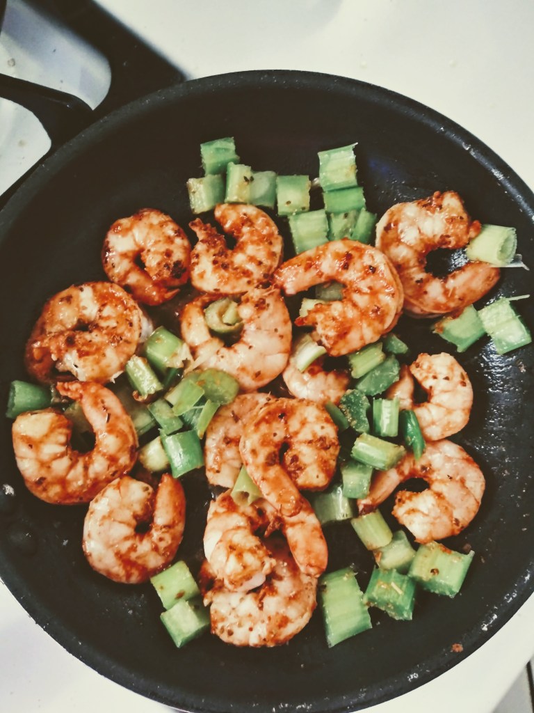 - Slowly sprinkle in celery and scallions. Sauté until browned and shrimp is cooked fully through, about 2 – 3 minutes. Add additional tablespoon of butter, if needed.